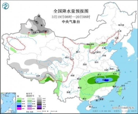 全國(guó)降水量預(yù)報(bào)圖(3月19日08時(shí)-20日08時(shí))