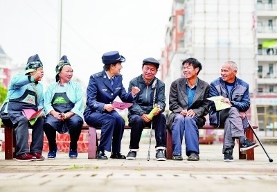 3月14日,在西平縣老王坡高標(biāo)準(zhǔn)服務(wù)中心的二樓平臺(tái),臺(tái)曉林(右)、王英凡和王仲琦(左)下班后在看夕陽(yáng)。