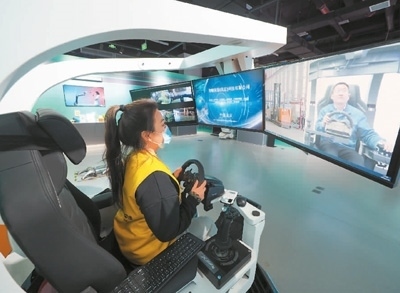 2月16日,在首鋼園中關村科幻產(chǎn)業(yè)創(chuàng)新中心元宇宙科技概念展上,工作人員在演示“5G云控系統(tǒng)”。杜建坡攝(人民圖片)