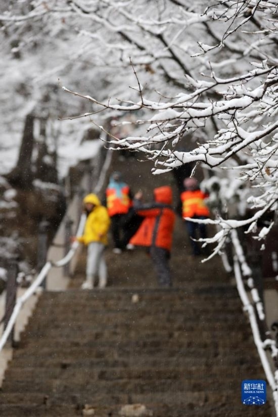 受冷空氣影響,位于甘肅省平?jīng)鍪械尼轻忌骄皡^(qū)迎來降雪,景色如畫。