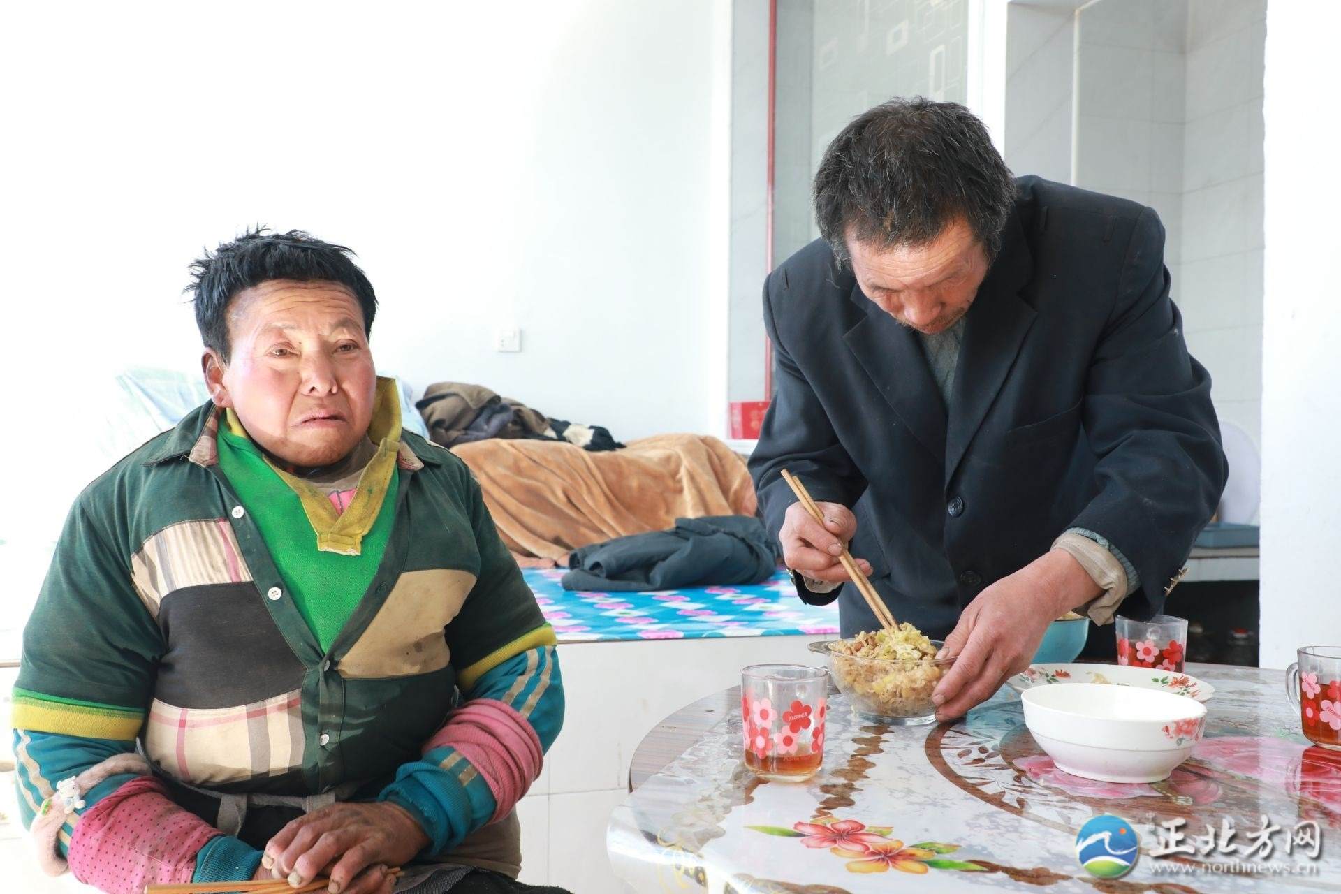 在采訪間隙,何蘭鎖的妻子王林愛(ài)回到了家,見(jiàn)到有陌生人顯得很局促。王林愛(ài)患有精神疾病,說(shuō)話顛三倒四。何蘭鎖拿起毛巾,溫柔地為妻子擦拭沾滿灰塵的臉和手,端出早早做好的飯放在桌上:“快吃吧,有你最?lèi)?ài)吃的咸菜?!薄傲謵?ài)其實(shí)命最苦了,啥也懂不得,我要不在了,她一個(gè)人可咋辦呀。我現(xiàn)在最大的心愿是希望能讓她去接受治療?!焙翁m鎖止不住地哽咽道。
