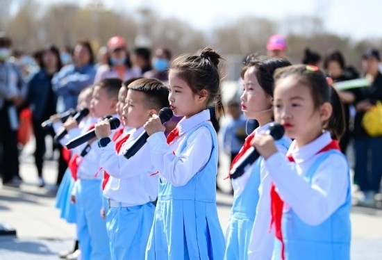 4月1日,小朋友在康巴什區(qū)亞洲雕塑藝術主題公園朗誦詩歌。