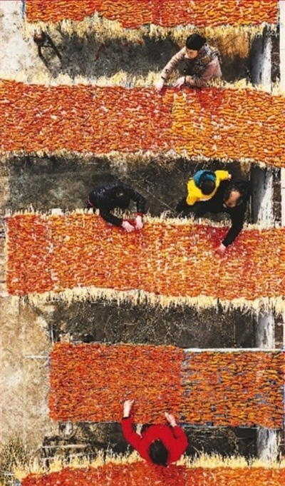 2022年12月16日,湖南省永州市新田縣枧頭鎮(zhèn)大觀堡村,村民在晾曬紅薯干。近年來,該縣利用訂單服務和農(nóng)村電商平臺,實現(xiàn)農(nóng)產(chǎn)品線上線下銷售。 劉貴雄攝(人民視覺)