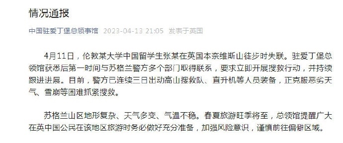 ·一名中國留學生在英國徒步時失聯(lián),中領(lǐng)館:已聯(lián)系警方,正抓緊搜救。