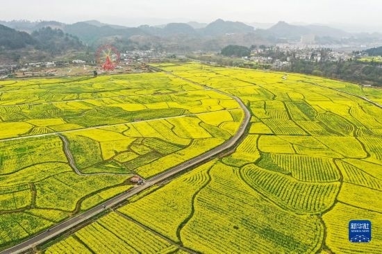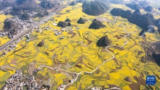 貴州省六盤水市六枝特區(qū)木崗鎮(zhèn)抵簸村的油菜花田(3月9日攝,無(wú)人機(jī)照片)。