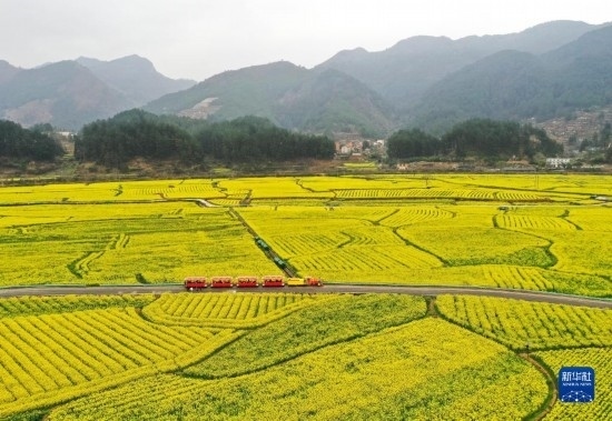 游客乘坐觀光小火車在貴州省貴定縣盤江鎮(zhèn)“金海雪山”景區(qū)觀賞油菜花海(3月12日攝,無(wú)人機(jī)照片)。