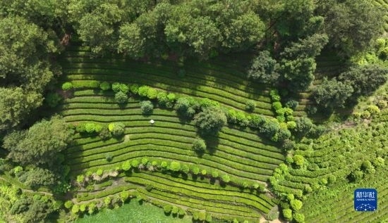 4月15日,村民在貴州省開陽縣南龍鄉(xiāng)田坎村一茶園采茶(無人機(jī)照片)。