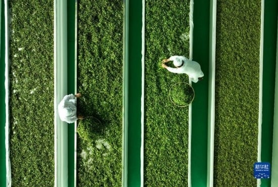 4月15日,在貴州省開陽縣南龍鄉(xiāng)翁朵村一茶葉加工廠,工人在攤晾茶青(無人機(jī)照片)。