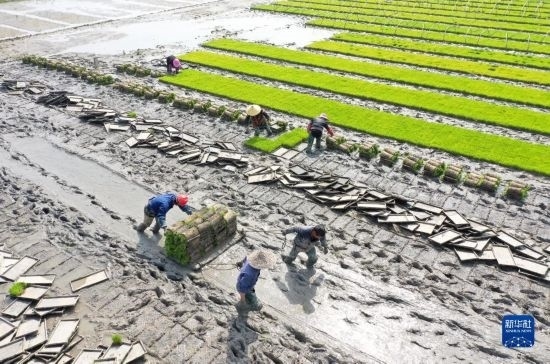 4月16日,在浙江省樂清市城東街道的一片秧田里,農(nóng)民在搬運(yùn)秧苗(無人機(jī)照片)。