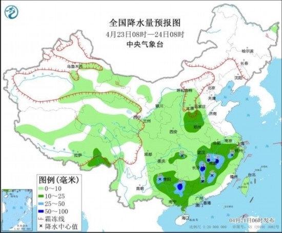 4月23日08時至24日08時,西藏東南部、青海東南部、甘肅西部、陜西北部、山西大部等地部分地區(qū)有小到中雪或雨夾雪,其中甘肅西部、山西中南部等地部分地區(qū)有大雪;、華北南部、黃淮西部、江淮南部、江南中東部、江漢東部、江南南部、西南地區(qū)東南部、華南北部和西部等地部分地區(qū)有中到大雨,其中,湖南南部、江西、廣西東北部等地部分地區(qū)有暴雨(50~90毫米)。內(nèi)蒙古西北部、黑龍江東北部、青海西部、浙江北部等地部分地區(qū)有4~6級風(fēng)。東海中南部海域、臺灣海峽將有5~6級、陣風(fēng)7級的東北風(fēng)。