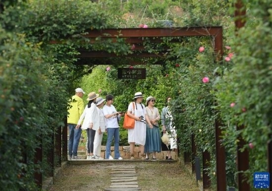 4月20日,參觀者在玫瑰莊園的花墻前留影。