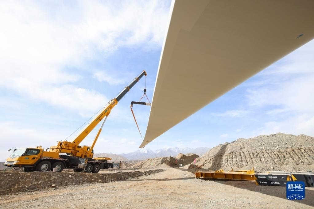 在新疆克孜勒蘇柯爾克孜自治州烏恰縣,風(fēng)機葉輪提升至相應(yīng)高度后與機艙對接(4月21日攝)。