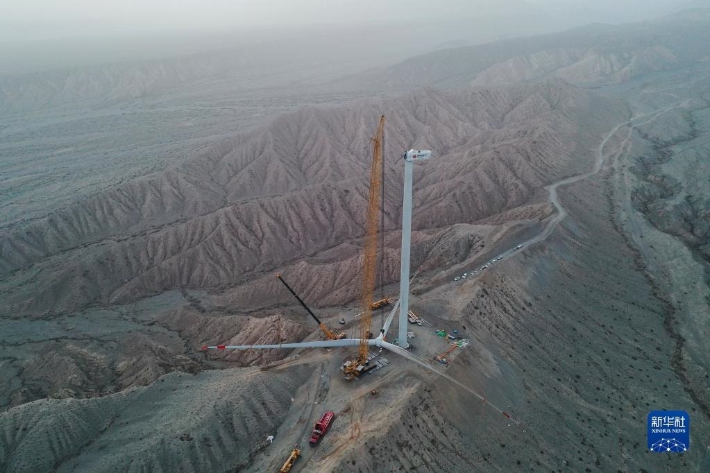 4月22日,在新疆克孜勒蘇柯爾克孜自治州烏恰縣,完成吊裝的風(fēng)機矗立在昆侖山北麓(無人機照片)。