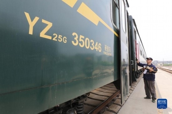 4月28日,中國鐵路上海局集團有限公司徐州站的鐵路連結員在對臨時旅客列車進行拉風作業(yè)(無人機照片)。