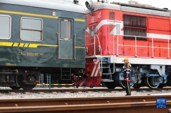4月28日,中國鐵路上海局集團有限公司徐州站的鐵路連結員在進行單機連掛車輛作業(yè)。