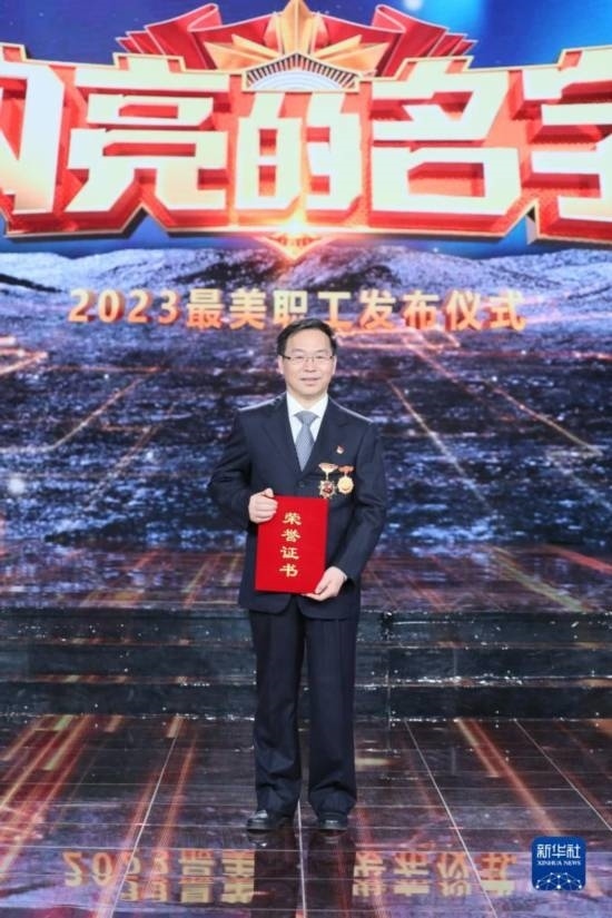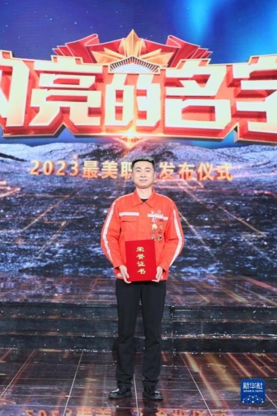 2023年“最美職工”在發(fā)布儀式上合影留念(4月21日攝)。新華社發(fā)(王鑫 攝)