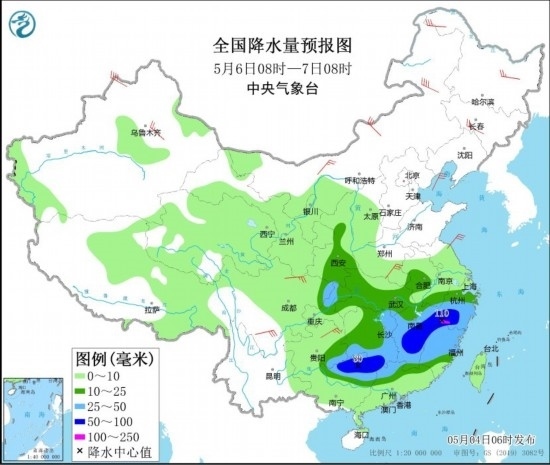 5月6日08時至7日08時,陜西中南部、江漢大部、江淮西部、江南、西南地區(qū)東北部、華南北部等地部分地區(qū)有中到大雨,其中,湖南南部、江西中部和東北部、浙江西南部、福建西北部、廣西北部等地部分地區(qū)有暴雨或大暴雨(100~110毫米)。內(nèi)蒙古中部和西北部、黑龍江東北部、吉林中部、新疆沿天山地區(qū)、河南南部、四川盆地西北部、四川南部、貴州東北部等地部分地區(qū)有4~6級風,其中,內(nèi)蒙古東北部、新疆北疆北部等地部分地區(qū)有6~7級風。