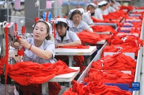 5月4日,在山東省青島市即墨區(qū)一家服裝企業(yè),工人生產(chǎn)出口到海外市場的服裝。