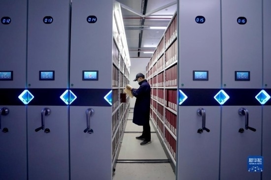4月28日,在上海市檔案館的庫房?jī)?nèi),保管部工作人員杜新慶在智能密集架間提取檔案。