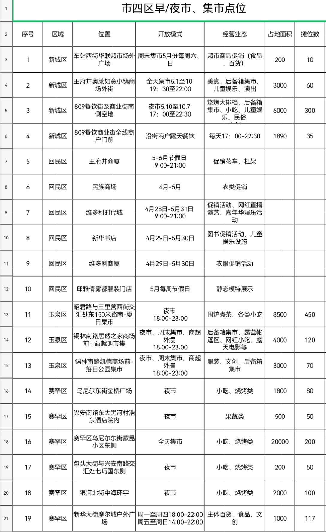 賽罕區(qū)6個,包括烏尼爾東街金橋廣場、興安南路東大黑河村浩東酒店院內(nèi)、賽罕區(qū)烏尼爾東街蒙昆小區(qū)東側(cè)、包頭大街與興安南路交會處七巧國東側(cè)、銀河北街中海環(huán)宇的夜市、全天集市,以及新華大街摩爾城戶外廣場售賣主體百貨、食品、文創(chuàng)的點位。