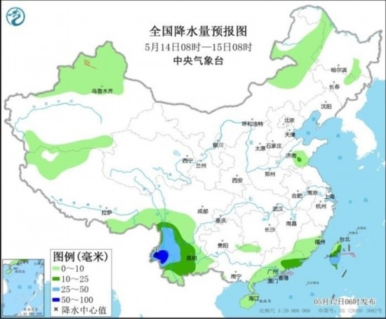 5月14日08時(shí)至15日08時(shí),西南地區(qū)南部、廣東東南部、臺(tái)灣島大部等地部分地區(qū)有中到大雨,其中,云南西南部等地部分地區(qū)有暴雨(50~70毫米)。新疆北疆北部部分地區(qū)有6~7級(jí)風(fēng)。