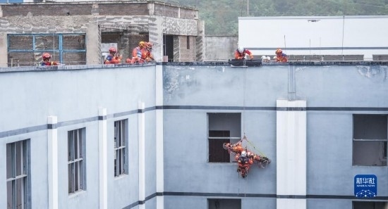 六盤水消防救援支隊(duì)隊(duì)員在轉(zhuǎn)運(yùn)“受傷人員”(5月11日攝)。