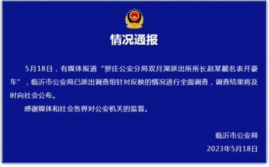 ·網(wǎng)傳山東省臨沂市羅莊區(qū)雙月湖派出所所長趙某戴名表、開豪車一事引發(fā)關(guān)注,臨沂市公安局發(fā)布情況通報(bào)。