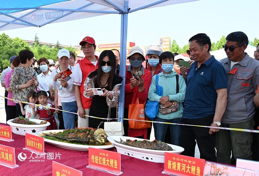 5月17日,“中國旅游日”主題周活動期間,河南省義馬市舉辦“櫻紅五月”美食節(jié),集中展示當(dāng)?shù)氐奶厣朗?、名?yōu)特產(chǎn),為了讓游客有更好的體驗,當(dāng)?shù)?2家飯店還進行了精彩紛呈的廚藝大比拼?;顒蝇F(xiàn)場,游客在圍觀經(jīng)典豫菜“紅燒黃河大鯉魚”。人民網(wǎng)記者 王玉興攝