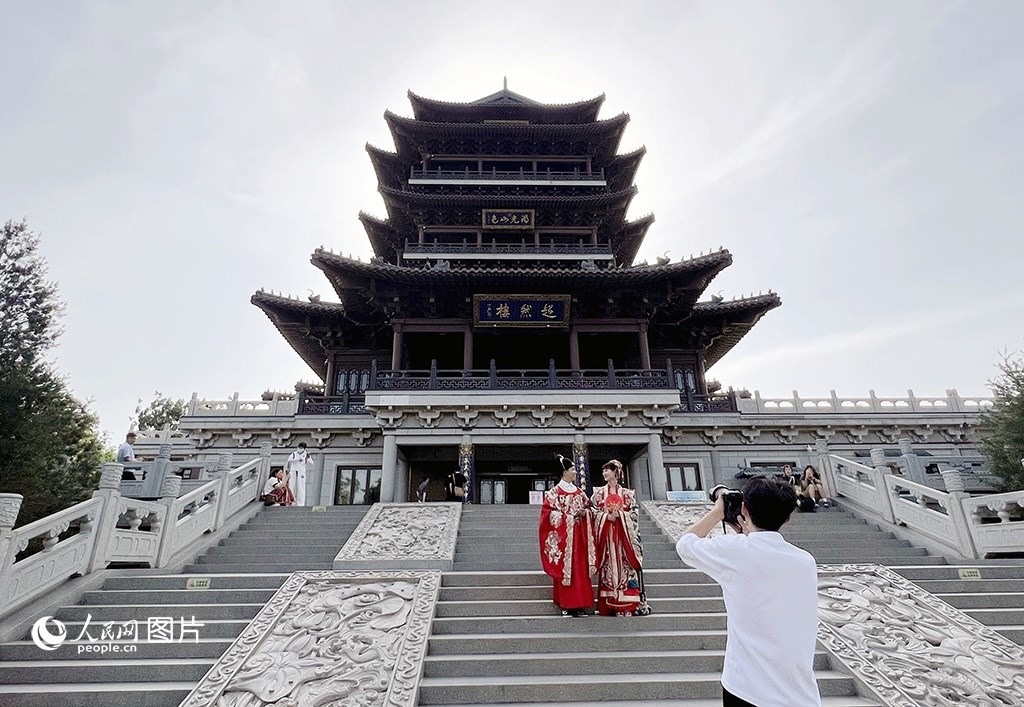 5月18日,游客在山西太原晉祠博物館與漢服演員一起合影。人民網(wǎng) 盧鵬宇攝
