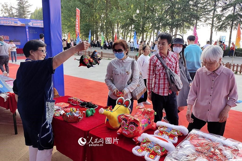 5月14日,“中國旅游日”主題周活動期間,河南省三門峽市陜州區(qū)在黃河岸邊舉辦“傳承多彩非遺”魅力陜州非物質(zhì)文化遺產(chǎn)展演體驗活動,大展傳統(tǒng)藝術(shù)魅力,為群眾獻上了一場“非遺文化盛宴”。在活動現(xiàn)場,當(dāng)?shù)厥〖壏沁z傳承人向游客展示文創(chuàng)產(chǎn)品布老虎。人民網(wǎng)記者 王玉興攝