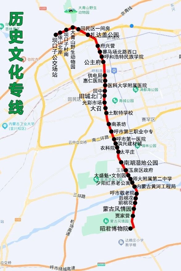 沿途設(shè)站:壩口子公交場(chǎng)站、依山北岸、壩口子村南、大青山野生動(dòng)物園、回民區(qū)一間房、扎達(dá)蓋公園、府興營(yíng)、賽馬場(chǎng)北路西口、呼和浩特民族學(xué)院、公主府、供電局、匯仁醫(yī)院、醫(yī)科大學(xué)附屬醫(yī)院、回中、舊城北門、光彩市場(chǎng)、大召、土默特學(xué)校、南茶坊、呼市第三職業(yè)中學(xué)、呼市第一醫(yī)院、洪興建材城、農(nóng)科院、太平莊、南湖濕地公園、玉泉區(qū)政府、大盛魁文創(chuàng)園、師大附屬第二中學(xué)、夕陽(yáng)紅養(yǎng)老公寓、內(nèi)蒙古黃河工程局、呼市敬老院、后桃花、前桃花、蒙古風(fēng)情園、賈家營(yíng)、昭君博物院。