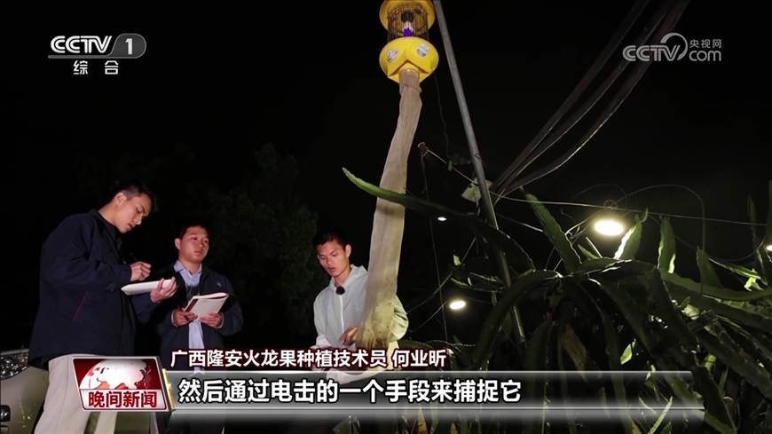 隆安火龍果種植技術(shù)員 何業(yè)昕:這個(gè)燈的話叫做幼蟲(chóng)燈,主要是通過(guò)一個(gè)燈光發(fā)出了一些光譜來(lái)吸引一些害蟲(chóng)來(lái),然后通過(guò)電擊的一個(gè)手段來(lái)捕捉它,然后集合到這個(gè)袋子里面。像這種燈的話,我們一般是20到25畝地放一盞,一個(gè)物理防治的手段。