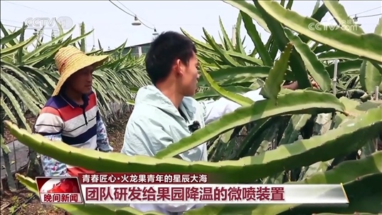 早上六點(diǎn)半,何業(yè)昕的團(tuán)隊(duì)和農(nóng)戶(hù)們開(kāi)始在火龍果園里干活了。這個(gè)時(shí)期是對(duì)火龍果樹(shù)護(hù)春梢、修枝的重要階段,有些枝丫已經(jīng)慢慢開(kāi)花。一到中午天氣熱起來(lái),火龍果地里熱辣辣一片,農(nóng)戶(hù)們最擔(dān)心的就是高溫對(duì)火龍果枝丫生長(zhǎng)的影響。為此,何業(yè)昕和團(tuán)隊(duì)伙伴做出了給果園降溫的裝置。