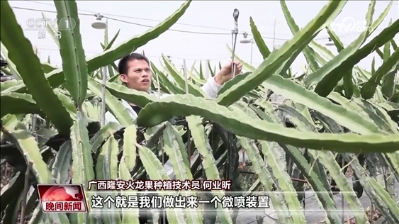 隆安火龍果種植技術(shù)員 何業(yè)昕:高溫來(lái)的時(shí)候,我們的火龍果雖然說(shuō)也能開(kāi)花能結(jié)果,但是商品性非常的差。這個(gè)就是我們做出來(lái)一個(gè)微噴裝置。在夏季高溫的時(shí)候,我們通過(guò)一個(gè)噴水,一個(gè)霧化的噴水出來(lái)之后,達(dá)到整個(gè)園子全部降溫,降到5度到8度左右。