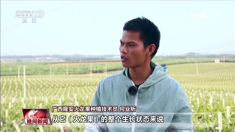 隆安火龍果種植技術(shù)員 林冠熙:不再是以前的那種面朝黃土背朝天的農(nóng)業(yè)模式,有時(shí)我們可能在電腦面前點(diǎn)開(kāi)開(kāi)關(guān),我們就可以給植物灌水灌肥。最開(kāi)心的應(yīng)該是看到豐收的季節(jié),看到滿地滿果通紅的畫(huà)面,就覺(jué)得這是豐收的喜悅。