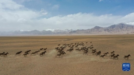一群藏野驢在阿爾金山國家級自然保護區(qū)奔跑(5月23日攝,無人機照片)。