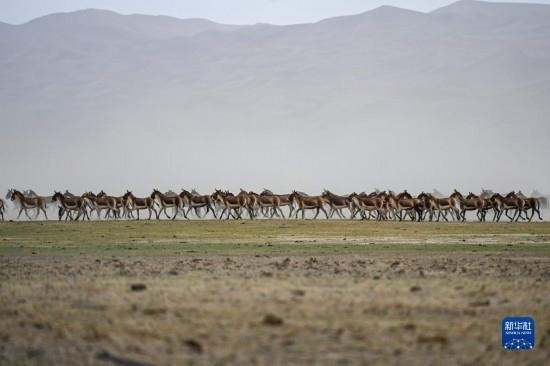 一群藏野驢在阿爾金山國家級自然保護區(qū)奔跑(5月23日攝)。