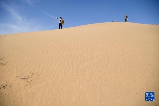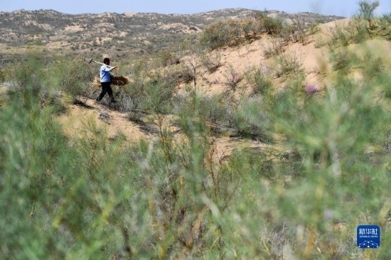 工作人員在白芨灘國(guó)家級(jí)自然保護(hù)區(qū)補(bǔ)扎草方格(6月7日攝)。
