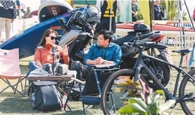 2023淀山湖(昆山)國(guó)際露營(yíng)節(jié)在江蘇省昆山市舉行。露營(yíng)節(jié)涵蓋露營(yíng)裝備展、飛盤(pán)活動(dòng)以及露營(yíng)派對(duì)等內(nèi)容,滿足露營(yíng)愛(ài)好者的多樣需求。圖為兩名游客在露營(yíng)裝備展區(qū)交流。唐旭騁攝(人民視覺(jué))