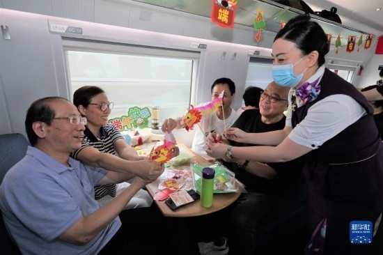 端午節(jié)前夕,鐵路上??瓦\段在列車上邀請旅客參加端午民俗活動,迎接端午佳節(jié)。