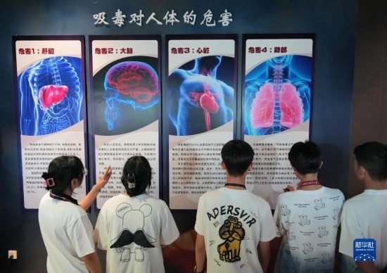 6月25日,高中生在山東省煙臺(tái)市牟平區(qū)禁毒教育基地了解吸毒對(duì)人體的危害。