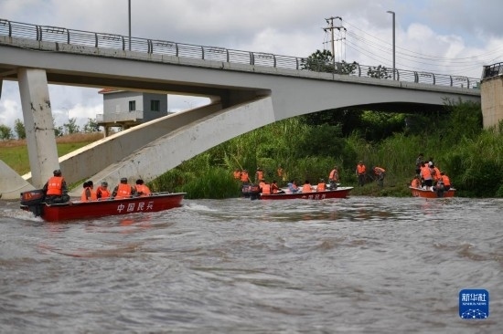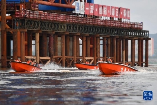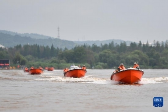 6月26日,防汛搶險應急演練人員駕駛沖鋒舟巡邏。