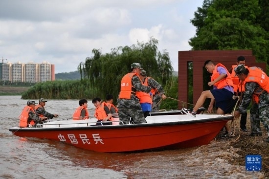 6月26日,防汛搶險應急演練人員駕駛沖鋒舟轉移“被困群眾”。