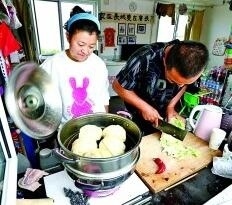 長城文保員郝中華(右)和妻子霍春玲在家中準備午飯。齊波攝