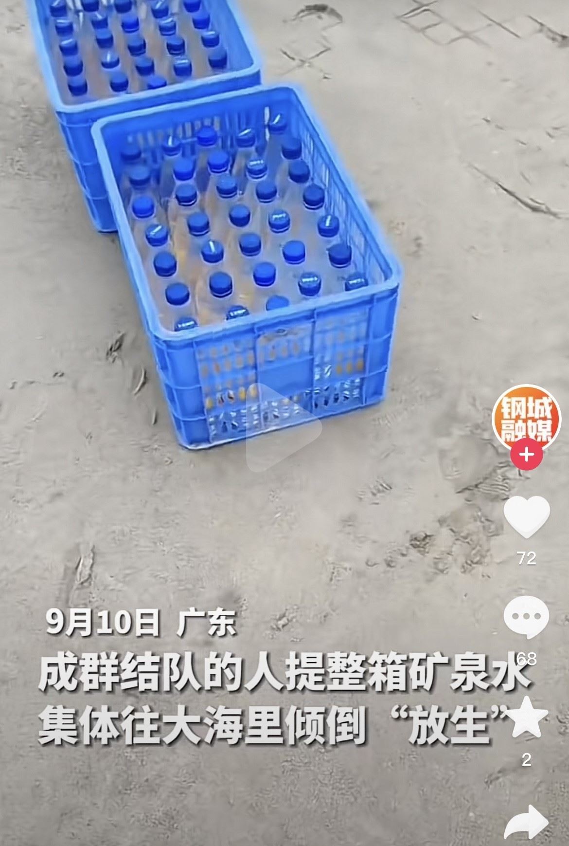 近日,有網(wǎng)友在社交平臺(tái)發(fā)布稱,廣東汕尾湖東港有一群人往海里“放生”礦泉水,60多箱礦泉水被浪費(fèi)?,F(xiàn)場(chǎng)視頻顯示,一群人抬著藍(lán)色的箱子正往海邊走,箱子里可見(jiàn)擺放整齊的礦泉水瓶。視頻發(fā)布者介紹,9月10日下午3點(diǎn)多來(lái)了兩輛大巴,大巴上坐滿了人。