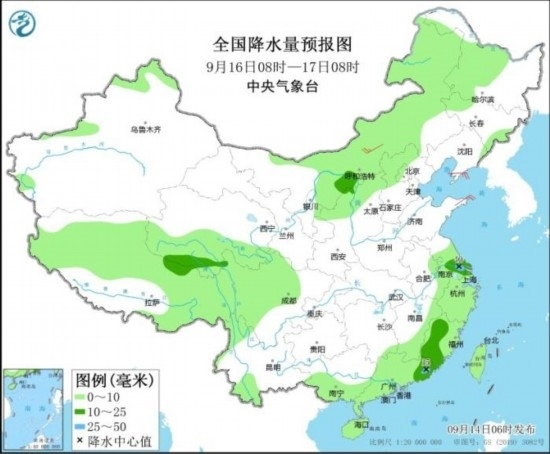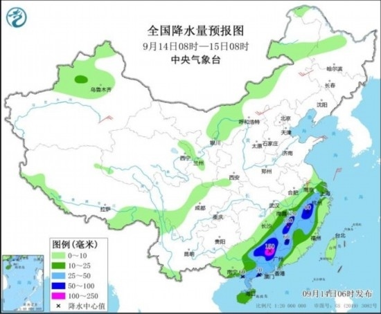 全國降水量預(yù)報(bào)圖(9月14日08時-15日08時)