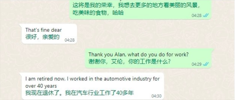 這個過程被他們稱為“切客”。張先生說,他們一般會通過分享新聞將對話引導(dǎo)到經(jīng)濟狀況的話題,然后進一步觀察對方有沒有投資的興趣?!叭绻磻?yīng)很好的話,就直接引導(dǎo)他去投資,如果不好就繼續(xù)聊感情?!?/p>