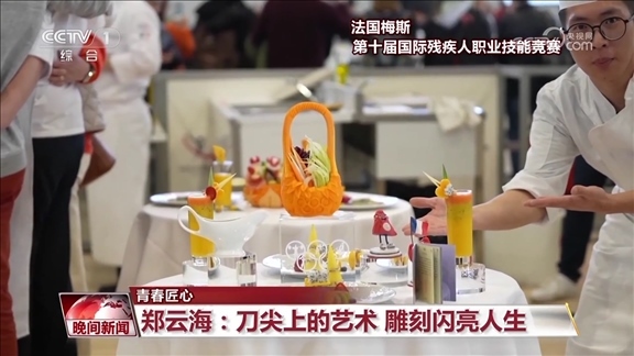 功夫不負有心人,鄭云海的雕刻技藝不斷精進,他也開始自主設(shè)計創(chuàng)作作品,并斬獲了多項國內(nèi)比賽冠軍。今年3月,在法國梅斯舉辦的第十屆國際殘疾人職業(yè)技能競賽食品雕刻項目比賽中,他奪得金牌,成為食品雕刻屆的世界冠軍。