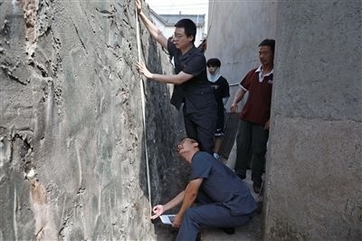 執(zhí)行干警確認(rèn)石磡墻高度。