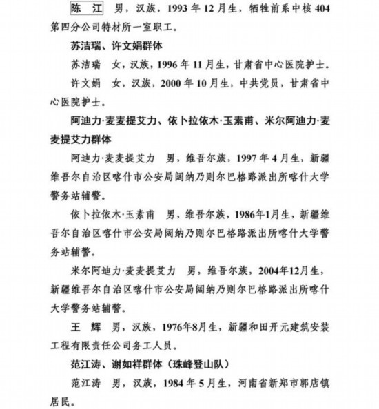 上榜勇士中,有從高橋上跳水救人導(dǎo)致胸椎骨折的外賣小哥彭清林和另一位高橋跳水救人的中學(xué)教師丁成闖;有冒著9級(jí)大風(fēng)在海上營(yíng)救遇險(xiǎn)臺(tái)胞的漁民蔡芳輪、蔡勝利;有放棄登頂珠峰機(jī)會(huì)而救助同胞的珠峰登山隊(duì)隊(duì)員范江濤、謝如祥;有萬(wàn)米高空機(jī)艙里搶救瀕危病人的護(hù)士長(zhǎng)劉素琴;有勇斗盜賊被刺幾刀仍不退縮的江蘇村民李培武;有身患癌癥卻橫渡淥江河救人的樂(lè)觀大姐鐘慧慈;有跳進(jìn)充滿沼氣深井救人致多器官感染的山東小伙李字旭;更有冒死救援落水群眾壯烈犧牲的潘燦燦、朱先鴿、尹新朋、喬軍、徐毅暉、楊華清、陳江七位勇士,讓我們致以最崇高的敬意!